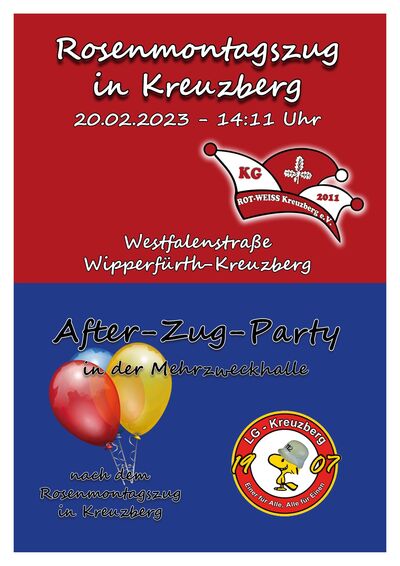 | Information | Am Rosenmontag findet auch in Kreuzberg endlich wieder der Karnevalszug statt! Start ist um 14:11 Uhr in der Westfalenstraße. Danach geht es in der Mehrzweckhalle mit der After-Zug-Party weiter. Wir freuen uns auf euch! |