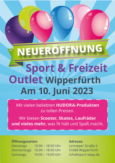 | Information | Einladung zur Neueröffnung vom Sport & Freizeit Outlet Wipperfürth... Am Samstag, den 10.06.23 in der Zeit von 10:00 - 14:00 Uhr SPECIALS ZUR ERÖFFNUNG: • Ballon-Clown (von 11:00-13:00 Uhr) • Glücksrad für die Kids mit tollen Gewinnen • Tolle Eröffnungsangebote |