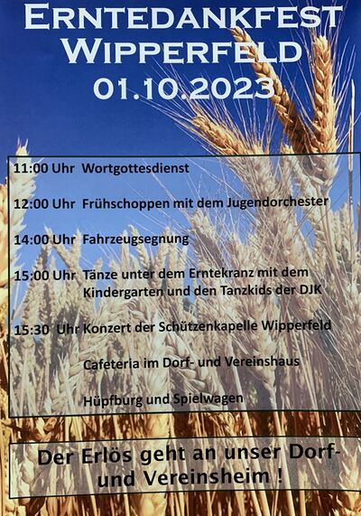 | Information | Traditionelles Erntedankfest im Kirchdorf Wipperfeld am Sonntag, den 01. Oktober 2023. 11 Uhr Wortgottesdienst in der Kirche St. Clemens Wipperfeld 12 Uhr Frühschoppen mit dem SKW-Jugendorchester 14 Uhr Fahrzeugsegnung 15 Uhr Tänze unter dem Erntekranz mit dem Kindergarten und den Tanzkids der DJK 15:30 Uhr Konzert der SKW Schützenkapelle Wipperfeld Cafeteria im Dorf- und Vereinshaus Hüpfburg und Spielwagen Der Erlös des Erntedankfesttages geht an das Wipperfelder Dorf- und Vereinsheim! |