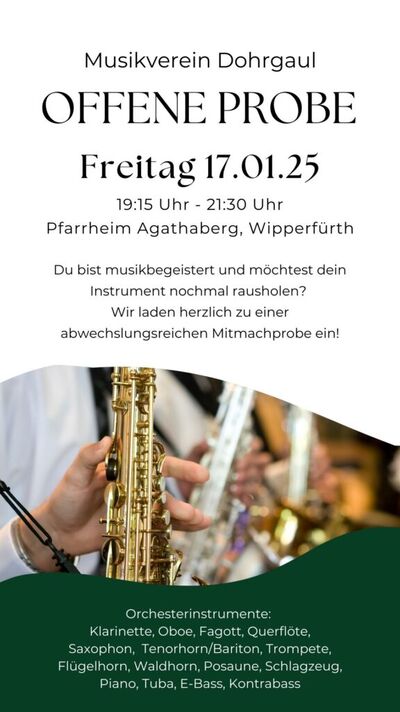 | Information | Der Musikverein Dohrgaul veranstaltet regelmäßig offene Proben / Mitmachproben. Wenn Du Lust hast, nochmal dein Instrument herauszuholen und in der Probenarbeit reinzuschnuppern, freuen wir uns, wenn Du uns bei unserer nächsten offenen Probe besuchst! Noten gibt es vor Ort. Vorbereiten brauchst Du dich nicht. Dir fehlt ein Instrument oder Du möchtest wissen, ob das richtige Equipment vor Ort ist? Dann melde Dich gerne per E-Mail bei uns oder schick uns eine Direct Message auf Instagram. |