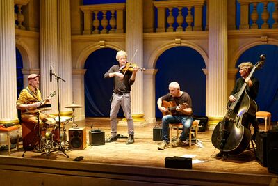 | Information | Mit Geige, Gitarre, Mandoline, Percussion und Kontrabass entsteht ein eigener, besonderer Band-Klang, der alles kann, ohne einen besonderen Stil für sich zu beanspruchen. VallesantaCorde spielen Musik, die verbindet, berührt, begeistert und die vor allen Dingen Spaß macht. Ursprünglich vom Klezmer und der Balkanmusik kommend, reist die toskanische Gruppe schon seit 20 Jahren gemeinsam durch die bunte Welt der Musik und hat bei der diesjährigen Frühjahrstour Musik aus Kuba, Irland, Frankreich, Deutschland, Italien, USA, Israel und dem Libanon mit im Repertoire. Die Mischung aus neuer und traditioneller Weltmusik, klassischen Themen und mitreißenden Rhythmen verbindet vor allem zwei Dinge: Leichtigkeit und die Liebe zum Detail. Ein Hörgenuss, den man sich nicht entgehen lassen sollte. Andreas Petermann (Geige), Fabio Roveri (Gitarre), Renate Titze (Kontrabass), Andi Bühler (Percussion/Mandoline) |
