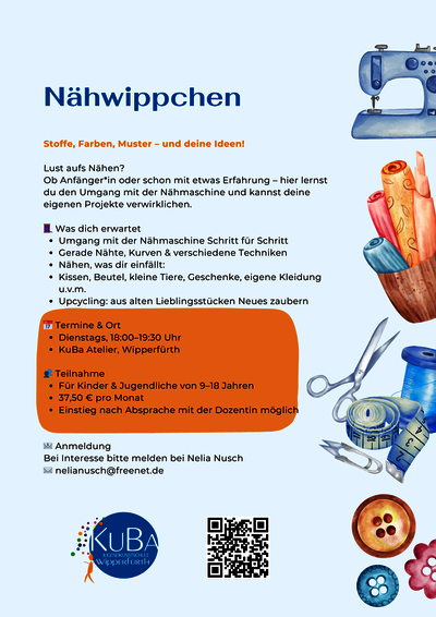 | Information | Nähwippchen Hier lernt ihr, mit der Nähmaschine umzugehen und verschiedene Techniken mit dieser einzusetzen. Und dann geht’s los und ihr näht, was Euch einfällt: Kissen, Beutel, kleine Geschenke und und und Mit viel Fantasie könnt ihr hier Eure Ideen verwirklichen! Für Kinder/ Jugendliche von 9 -18 Jahre Teilnahmegebühr: 37,50€ pro Monat Zum Schnuppern bitte anmelden unter: info@kunstbahnhof-wipperfuerth.de oder direkt bei Nelia Nusch: nelianusch@freenet.de Wir freuen uns auf Euch! |
