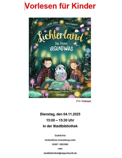 Information | Es wird eine Geschichte für Kinder von 3 bis 4 Jahren vorgelesen. Wann? Dienstag, den 04.11.2025 von 15.00 - 15.30 Uhr Wo? Stadtbibliothek Wipperfürth Marktplatz 9 51688 Wipperfürth Eine Anmeldung ist erforderlich. Der Eintritt ist frei. Tel. 02267 / 8623980 stadtbibliothek@wipperfuerth.de |