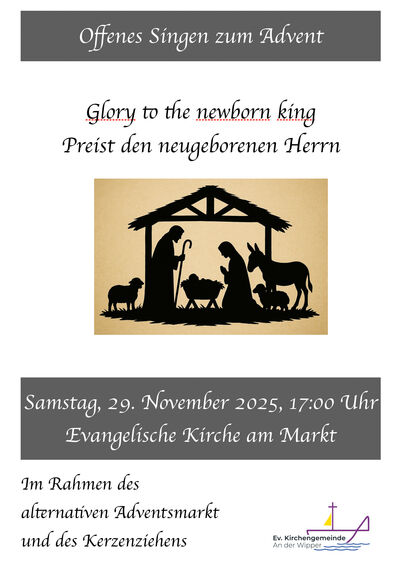 | Information | Im Rahmen des alternativen Adventsmarktes und des Kerzenziehens in der Evangelischen Kirche am Markt führt die Evangelische Kirchengemeinde an der Wipper ein offenes Adventssingen durch. Alle sind herzlich mitsingen und zuhören, aber auch zum Kerzenziehen eingeladen. Leitung: Kantor Michael von Rekowski Musikalische Darbietungen: Chor Canto |