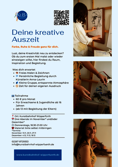 | Information | Deine kreative Auszeit Farbe, Ruhe und Freude ganz für Dich In diesem Kurs mit Anna- Laurin Blumberg kannst Du Deine Kreativität ganz neu entdecken! Ob Du zum ersten Mal malst, oder wieder einsteigen willst- hier findest du Raum, Inspiration und Begleitung. Drei Abende im November: 04.12./11.12./18.12.2025 Für Erwachsene oder Jugendliche ab 16J in Begleitung Teilnahmegebühr: 60€ für alle drei Termine Haben wir Dein Interesse geweckt? Dann melde Dich an unter: info@kunstbahnhof-wipperfuerth.de Wir freuen uns auf Dich! |