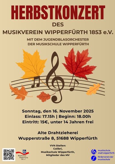 | Information | Wir laden Sie herzlich zum traditionellen Herbstkonzert des Musikverein Wipperfürth mit dem Jugendblasorchester der Musikschule Wipperfürth in die Alte Drahtzieherei ein! Sonntag, 16.11.2025 - Einlass 17.15 Uhr - Beginn 18.00 Uhr Alte Drahtzieherei, Wupperstr. 8, 51688 Wipperfürth Eintritt: 15€, unter 14 Jahren frei |