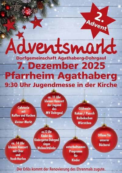 | Information | Viele Vereine aus Dohrgaul und Agathaberg gestalten als Dorfgemeinschaft gemeinsam ein Adventsmarkt. Der Erlös des Adventsmarktes geht zu 100% in die sehr notwendige Renovierung des Ehrenmals Agathaberg. |