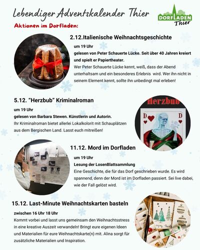 | Information | um 19 Uhr gelesen von Peter Schauerte Lücke. Seit über 40 Jahren kreiert und spielt er Papiertheater. Wer Peter Schauerte Lücke kennt, weiß, dass der Abend unterhaltsam und ein besonderes Erlebnis wird. Wer ihn nicht in seinem Element kennt, sollte ihn unbedingt mal erleben! Diese Veranstaltung findet im Rahmen des lebendigen Adventskalender Thier statt. Wir freue uns, euch im Dorfladencafé zu begrüßen! Eine besinnliche Zeit Ulla, Manni, Anette und Alina |