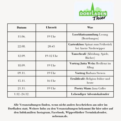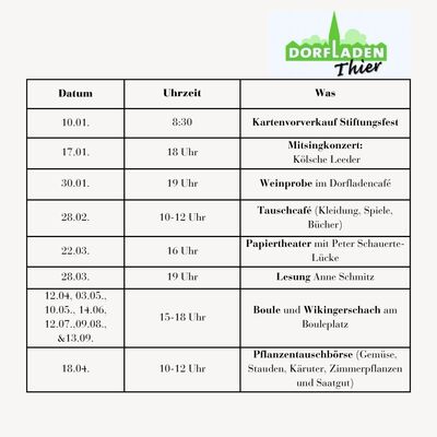 | Information | Safe the Dates! Wir haben Mal wieder ein richtig gutes und buntes Programm für alle - nicht nur für Thierer. Auf social Media und hier werdet ihr über die Termine noch weiter informiert. |