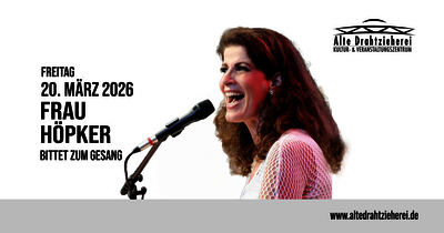 | Information | Das Mitsingkonzert Frau Höpker hat’s erfunden. Aus purer Freude an der Musik und am Singen mit Gleichgesinnten entwickelte die Kölner Profimusikerin 2008 ein neues Veranstaltungsformat und nannte es treffsicher „Frau Höpker bittet zum Gesang“. Seitdem begeistert die Sängerin und Pianistin ein ständig wachsendes Publikum mit einem musikalischen Gesangserlebnis, das mehr ist als “nur” gemeinsames Singen und seinesgleichen sucht. Das Geheimnis liegt in der unnachahmlichen Mischung aus Können, Kreativität, Charisma und Intuition der Künstlerin. |