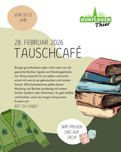 | Information | Schaut gerne (wieder) vorbei, werdet fündig und bringt aussortiertes gerne mit. Vielleicht sucht jemand genau dieses Buch, Spiel oder Kleidungsstück. Keine Anmeldung notwendig. |