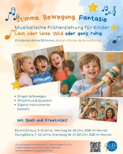 | Information | StimmZirkus Musikalische Früherziehung für Kinder Entdecke Deine Stimme, Deinen Körper und Deine Sinne mit Spaß und Kreativität! StimmZirkus: montags 15-16Uhr für Kinder von 3 – 6 Jahre, 30€ monatlich YoungStars:montags, 16 -17:30Uhr, für Kinder von 7 – 12 Jahre, 41€ monatlich Haben wir Dein Interesse geweckt? Dann melde Dich an unter: info@kunstbahnhof-wipperfuerth.de Wir freuen uns auf Dich! |