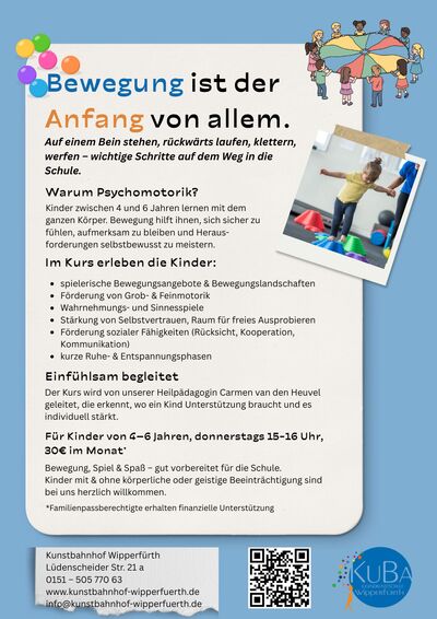 | Information | Psychomotorikkurs Mit Bewegung stark werden – Psychomotorik für Kinder von 4-6 Jahren In diesem Kurs entdecken Kinder spielerisch ihre Bewegungsfreude und stärken Körpergefühl, Selbstvertrauen und soziales Miteinander. Mit Fantasie, Bewegungsspielen und abwechslungsreichen Materialien werden Motorik, Wahrnehmung und Konzentration gefördert. Die heilpädagogische Psychomotorik unterstützt jedes Kind individuell – mit Spaß, Wertschätzung und Raum zum Ausprobieren. Donnerstags, 15 – 16 Uhr im KuBa Studio Teilnahmegebühr: 30€ monatlich Haben wir Dein Interesse geweckt? Dann melde Dich an unter: info@kunstbahnhof-wipperfuerth.de Wir freuen uns auf Dich! |