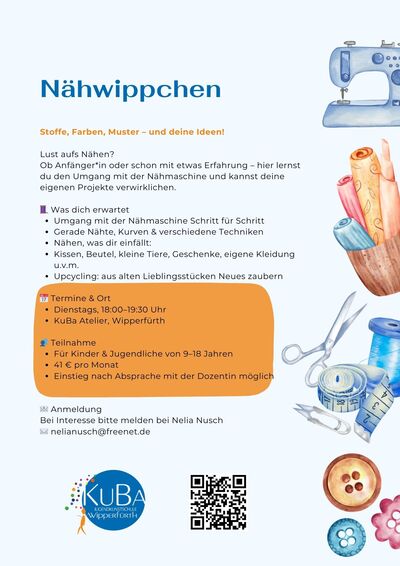 | Information | Nähwippchen Hier lernt ihr, mit der Nähmaschine umzugehen und verschiedene Techniken mit dieser einzusetzen. Und dann geht’s los und ihr näht, was Euch einfällt: Kissen, Beutel, kleine Geschenke und und und Mit viel Fantasie könnt ihr hier Eure Ideen verwirklichen! Für Kinder/ Jugendliche von 9 -18 Jahre Teilnahmegebühr: 41€ pro Monat Zum Schnuppern bitte anmelden unter: info@kunstbahnhof-wipperfuerth.de oder direkt bei Nelia Nusch: nelianusch@freenet.de Wir freuen uns auf Euch! |