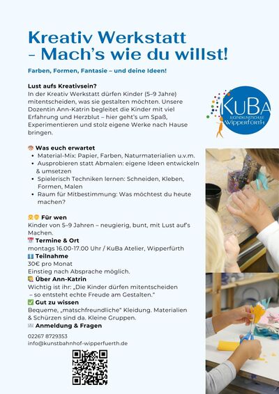 | Information | Kreativwerkstatt Ihr zeichnet, malt oder gestaltet gerne? Ihr möchtet Eure Ideen verwirklichen oder seid auf der Suche nach neuen Anregungen? Dann seid ihr in diesem Kurs genau richtig! Jeden Montag für Kinder von 5-9 Jahre Teilnahmegebühr: 30€ pro Monat Wir freuen uns auf Dich! Anmeldung zum Schnuppern unter: info@kunstbahnhof-wipperfuerth.de |