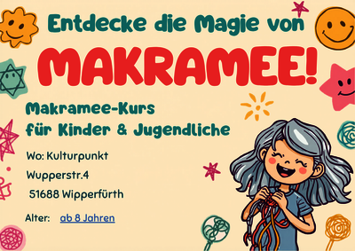 | Information | In einer Kleingruppe von drei bis sechs Kindern gestalten wir gemeinsam kreative Makramee-Arbeiten wie Schlüsselanhänger, Armbänder oder Ketten. Die Kinder lernen grundlegende Knotentechniken kennen und setzen eigene Ideen gestalterisch um. Das Arbeiten mit Garn fördert Feinmotorik, Konzentration und Ausdauer. Gleichzeitig stärkt die kleine Gruppengröße soziale Kompetenzen wie gegenseitige Unterstützung, Geduld und Wertschätzung. Am Ende nimmt jedes Kind ein selbstgefertigtes Unikat mit nach Hause – ein sichtbares Ergebnis eigener Kreativität und Selbstwirksamkeit. |