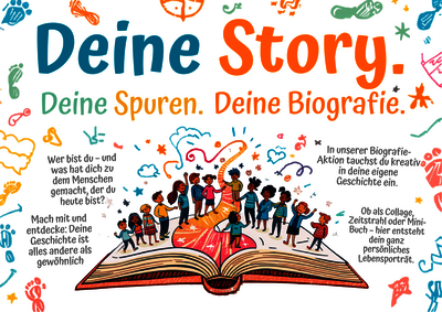 | Information | Wer bist du – und was hat dich zu dem Menschen gemacht, der du heute bist? In unserer Biografie-Aktion tauchst du kreativ in deine eigene Geschichte ein. Mit Fragen, Impulsen und spannenden Methoden hältst du Erinnerungen, Wendepunkte, Lieblingsmomente und Zukunftsträume fest. Ob als Collage, Zeitstrahl oder Mini-Buch – hier entsteht dein ganz persönliches Lebensporträt. Kein trockener Rückblick, sondern ein Blick auf deine Stärken, Erfahrungen und das, was dich besonders macht. Mach mit und entdecke: Deine Geschichte ist alles andere als gewöhnlich. Am Ende der zwei Tage, nimmst du deine Biografie mit und kannst sie jederzeit zu Hause weiterführen oder ein weiteres Kapitel schreiben. Bringt euch gerne eigene ausgedruckte Bilder mit, von Menschen die in eurem Leben eine Rolle gespielt haben, oder von Haustieren, besonderen Momenten, Urlauben oder was für euch sonst noch wichtig war oder ist. Bringt auch gerne Sticker oder sonstige Sachen, die euch einfallen mit. Anmeldung über https://wipperfuerth.feripro.de/anmeldung/36/veranstaltungen |