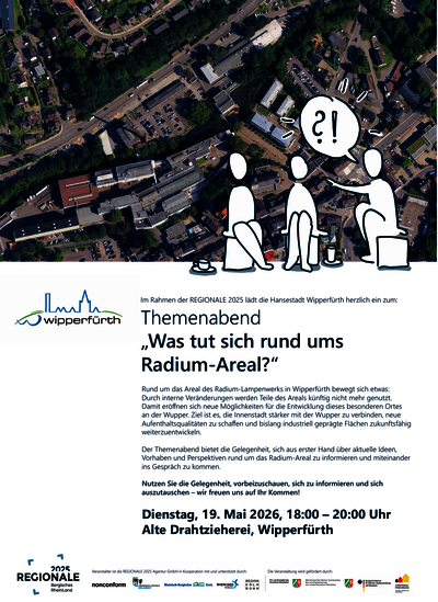 | Information | Im Rahmen der REGIONALE 2025 lädt die Hansestadt Wipperfürth herzlich ein zum: Themenabend „Was tut sich rund ums Radium-Areal?“ Rund um das Areal des Radium-Lampenwerks in Wipperfürth bewegt sich etwas: Durch interne Veränderungen werden Teile des Areals künftig nicht mehr genutzt. Damit eröffnen sich neue Möglichkeiten für die Entwicklung dieses besonderen Ortes an der Wupper. Ziel ist es, die Innenstadt stärker mit der Wupper zu verbinden, neue Aufenthaltsqualitäten zu schaffen und bislang industriell geprägte Flächen zukunftsfähig weiterzuentwickeln. Der Themenabend bietet die Gelegenheit, sich aus erster Hand über aktuelle Ideen, Vorhaben und Perspektiven rund um das Radium-Areal zu informieren und miteinander ins Gespräch zu kommen. Nutzen Sie die Gelegenheit, vorbeizuschauen, sich zu informieren und sich auszutauschen – wir freuen uns auf Ihr Kommen! |