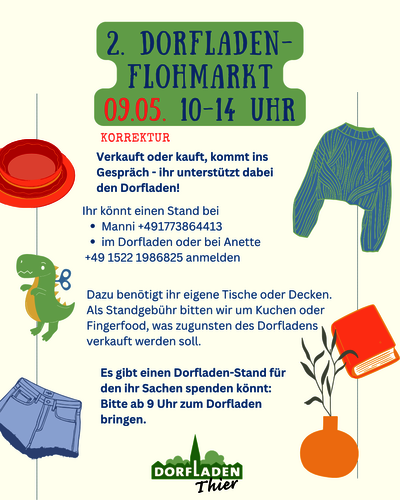 | Information | Korrektur! Das richtige Datum ist am 9.5.20263️⃣Zum 3. Mal wollen wir wieder einen Flohmarkt rund um den Dorfladen veranstalten. Wenn ihr euch an diesem Tag mit einem Flohmarktstand beteiligen wollt, dann meldet euch bitte bis zum 8. Mai telefonisch unter 022678884400 im Dorfladen mit Name und Telefonnummer an. Bei Nachfragen ist Manni der beste Ansprechpartner, siehe Plakat. Bringt gerne eine Decke oder einen Tisch für eure Verkaufssachen und eventuell eine Sitzgelegenheit mit. Als Standgebühr möchten wir euch bitten, einen Kuchen oder Fingerfood mitzubringen, welches dann über das Dorfladen-Café zu Gunsten des Dorfladens an diesem Tag verkauft werden soll. Es wird auch einen Flohmarktstand vom Dorfladen zu Gunsten des Dorfladens geben. Wer dafür gut erhaltene Verkaufssachen spenden möchte, kann diese ab 9:00 Uhr gerne am Dorfladen vorbeibringen. Und natürlich freuen wir uns über alle, die an diesem Tag vorbeischauen, an den Ständen vorbeischlendern, vielleicht etwas kaufen, im oder vor dem Dorfcafé etwas essen und trinken oder einfach miteinander ins Gespräch kommen. |