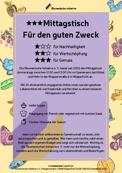 | Information | Die Ökumenische Initiative e. V. bietet seit 2002 den Mittagstisch donnerstags zwischen 12.00 und 13.00 Uhr im Speiseraum bei Möbel und Mehr in der Wupperstraße 6 in Wipperfürth an. Mit 20 ehrenamtlich engagierten Helfer:innen werden gerettete Lebensmittel mit viel Kreativität und Herzblut zu einem leckeren Mittagessen verarbeitet: frischer Obstsalat der Saison Hauptgang mit Fleisch oder vegetarisch mit buntem Salat. Jede:r ist herzlich willkommen in Gemeinschaft zu essen, sich auszutauschen und zu genießen. Wer kann und möchte, zahlt einen Beitrag nach eigenem Budget und zeigt sich solidarisch. Wichtig ist der Ökumenischen Initiative e. V. nicht nur die Wertschöpfung, sondern auch die Wertschätzung von Lebensmitteln und Bedürftigen. Ein kostenloses Angebot der Ökumenischen Inititiave e. V. | Wupperstraße 6 | 51688 Wipperfürth | 02267 680 831 | info@oeku-ini.de |