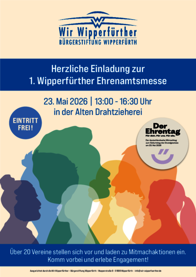 | Information | Du möchtest dich informieren, mit Menschen ins Gespräch kommen und herausfinden, wie du dich engagieren kannst? Dann bist du beim 1. Wipperfürther Ehrenamtstag am 23. Mai 2026 in der Alten Drahtzieherei genau richtig! Lerne Vereine, Initiativen und Institutionen aus der Region kennen und entdecke die vielfältigen Möglichkeiten des ehrenamtlichen Engagements – ganz unverbindlich und passend zu deinen Interessen und zeitlichen Möglichkeiten. Informieren – Inspirieren – Engagieren Mehr als 20 Vereine stellen sich vor! Freu dich auf: • Informationen aus erster Hand direkt von engagierten Vereinen und Initiativen • Persönliche Gespräche mit Menschen, die sich bereits mit Herzblut einsetzen • Vielfältige Einsatzmöglichkeiten für jedes Alter und unterschiedliche Interessen • Mitmachaktionen und Vorführungen, die spannende Einblicke in die Arbeit der Organisationen geben Ob soziales Engagement, Kultur, Sport oder Kinder- und Jugendhilfe – entdecke, wie bereichernd ehren amtliche Arbeit sein kann und wo Unterstützung gebraucht wird. Für das leibliche Wohl ist selbstverständlich gesorgt. Ehrenamt stärkt die Gemeinschaft, schafft Begegnungen und prägt das eigene Leben durch neue Erfahrungen. Komm vorbei und finde dein Engagement! Der Eintritt ist frei. Wir freuen uns auf deinen Besuch! |